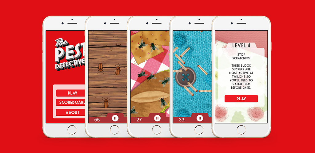 We devised the original concept for the game – a pest squashing app where users tap pests as they came on the screen. As the idea developed, custom pest and background illustrations were created and built into the app, while problems were incorporated to make the game more challenging (Bedbugs are most active at dusk, so the screen gets darker as the level progresses, Cockroaches are notoriously difficult to kill so they must be tapped three times to get the points). Scores for the game are stored on Apple and Android native leaderboards, while also being sharable via social networks.